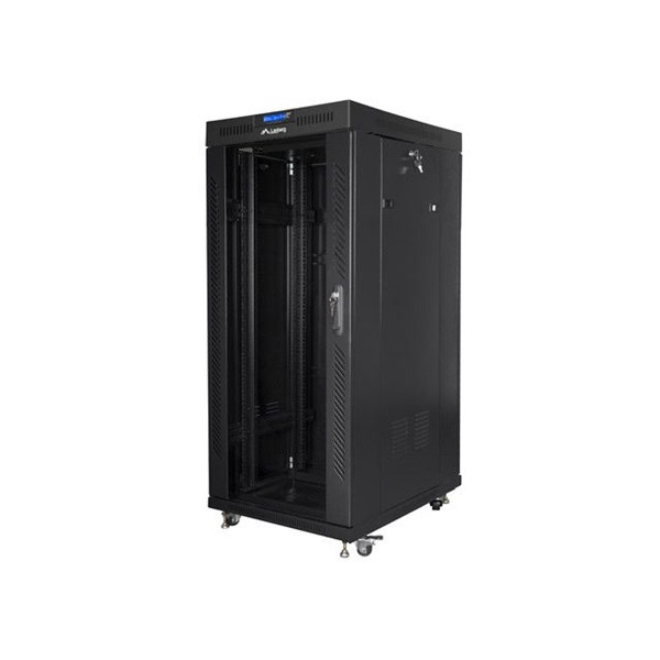 Lanberg FF01-6827-12BL 19" 27U SZÉL:600mm MÉLY:800mm MAG:1431mm lapraszerelt LCD üvegajtós fekete rack szekrény
