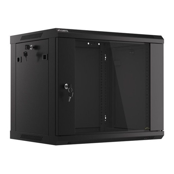 Lanberg WF01-6409-10B 19" 9U SZÉL:600mm MÉLY:450mm MAG:512mm lapraszerelt üvegajtós fekete fali rack szekrény