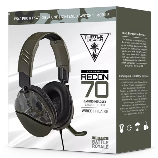 Széles körű kompatibilitásA Recon 70 univerzálisan kompatibilis a 3,5 mm-es jack csatlakozón keresztül.Kifejezetten PS4™ Pro és PS4™, Xbox One, PC, Mac, valamint mobil/tablet eszközök számára készült. (Bizonyos eszközökhöz külön megvásárolható fejhallgató-audio adapter szükséges.)Új, elegáns és könnyű kialakításAkár hosszú órákon keresztül kényelmesen játszhatsz a puha műbőr fülpárnáknak köszönhetően.Kristálytiszta hangzás, amely részletgazdag és magával ragadó játékélményt biztosít.Flip-Up MikrofonA Turtle Beach híres nagy érzékenységű mikrofonja tisztán és hangosan továbbítja a hangodat, így a csapattársaid mindig jól hallják az utasításaidat.Ha nincs szükséged a mikrofonra, egyszerűen felhajthatod, és az elegánsan beleolvad a headset dizájnjába.Műszaki specifikációkKompatibilis eszközök: XBOX SERIES X|S | XBOX ONE | PS4™ PRO, PS4™ & PS5™ | NINTENDO SWITCH™* | MOBIL/ PC Gaming – 3,5 mm jack vagy Pink/Green PC Splitter kábel (nem tartozék)- Csatlakozás: 3,5 mm jack- Frekvenciaátvitel: 20 Hz - 20 kHz- Hangszórók: 40 mm- Mikrofon: mindenirányú mikrofon- Fejpánt anyaga: műbőr, memóriahabos párnázással- Fülpárnák anyaga: műbőr & memóriahab- Kezelőgombok: hangerőszabályzó, mikrofon némításCsomag tartalma: