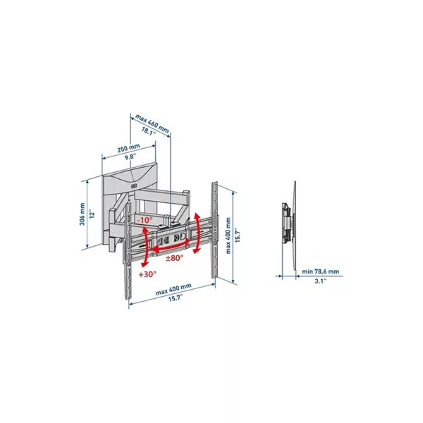 A 400 SDRP PLUS egy dupla-karos, kétcsuklós VESA 200 – 300 – 400 mm felfogatású TV-khez készült konzol, lehetővé teszi a képernyő függőleges és vízszintes megdöntését, alkalmas közepes és nagy formátumú TV-khez. Az EASY TILT PRO funkció amellett, hogy lehetővé teszi a TV függőleges dőlésszögének szabad megváltoztatását, garantálja, hogy a TV a betolt állapotban is vízstintes marad, csavarhúzó használata nélkül.