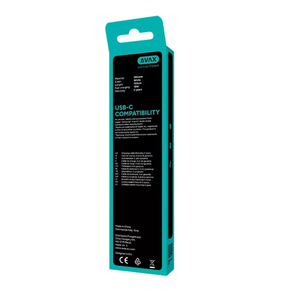 Az AVAX USB-C kábel nemcsak töltésre, hanem adatkábelként is használható. A beépített védelemmel ellátott kialakítás segít megóvni az akkumulátort a túlmelegedéstől, túltöltéstől és feszültségingadozástól, így biztonságos és megbízható megoldást nyújt.