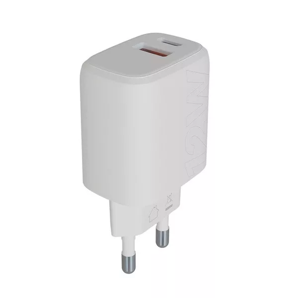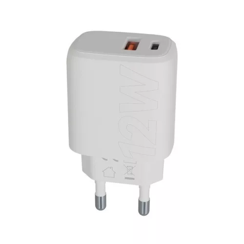 A SPEEDY termékcsaládhoz tartozó CH312W, fehér színű, 12W-os hálózati töltőadapter egy USB-A porttal és egy USB-C töltő porttal rendelkezik, lehetővé téve két eszköz egyidejű töltését.