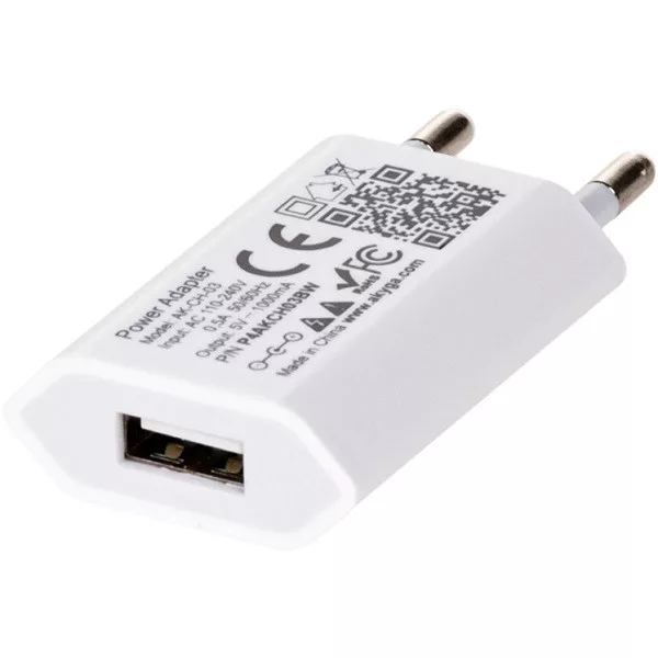 Az Akyga AK-CH-03WH egy univerzális, alapvető USB 5W-os töltőkészülék 5V / 1A paraméterekkel, tápellátása 110 ~ 240V, 0,5A, 50 / 60Hz hálózati feszültséggel. Ez lehetővé teszi az okostelefonok, táblagépek, navigációs, tápelemek és más mobil eszközök gyors töltését USB porton keresztül.