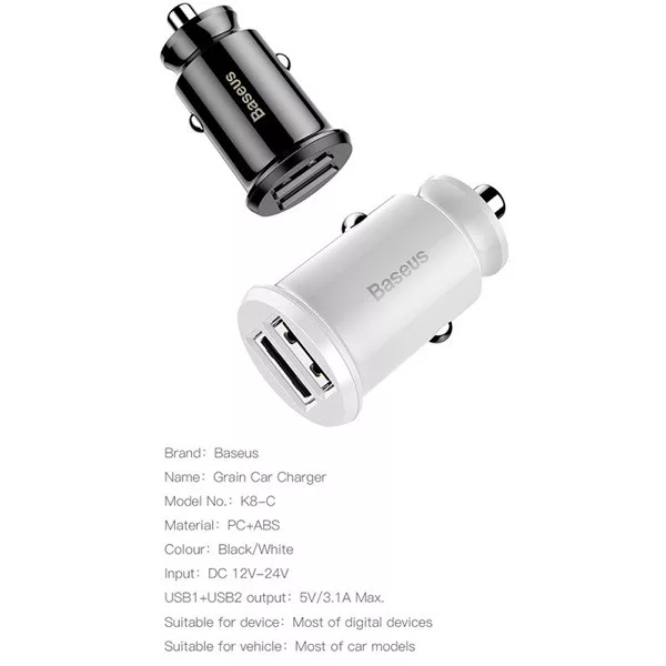 Specifikáció:Márka: BaseusNév: Grain autós töltőAnyaga: PC + ABSPrémium minőségErgonomikus kialakításPortok: 2x USB 2.0Input: DC 12 - 24 VKimenet: 5V / 3.1A (max)További jellemzők: LEDMéret: 3,7 x 2,3 x 2,3 cm-esTömeg: 13 g