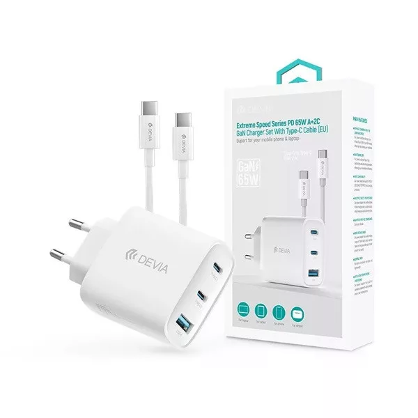 Devia ST111967 Extreme Speed Series 65W GaN PD fehér hálózati gyorstöltő adapter + USB-C+USB-C kábel