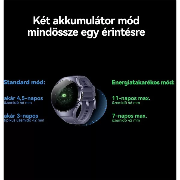 Használd a Standard módot kedvenc funkcióid eléréséhez, vagy hozz ki még többet órádból az Energiatakarékos móddal22. Mindössze pár másodperc alatt válthatsz a két mód között, így mindig könnyedén az adott napi igényeidhez igazíthatod az órát.