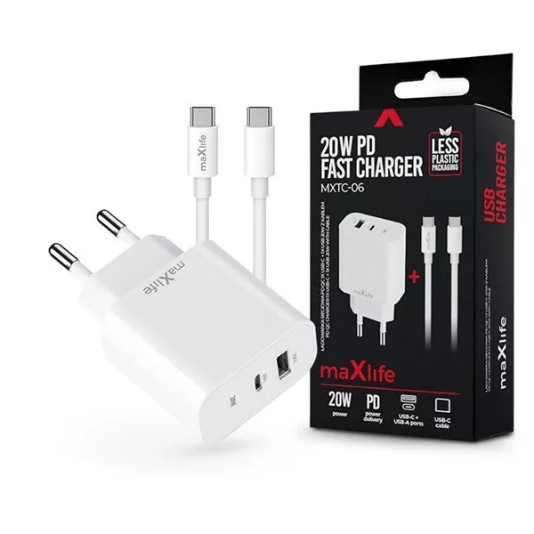 Maxlife ML738409 MXTC-06 PD+QC 20W USB+USB-C+USB-C/USB-C kábel fehér hálózati gyorstöltő adapter