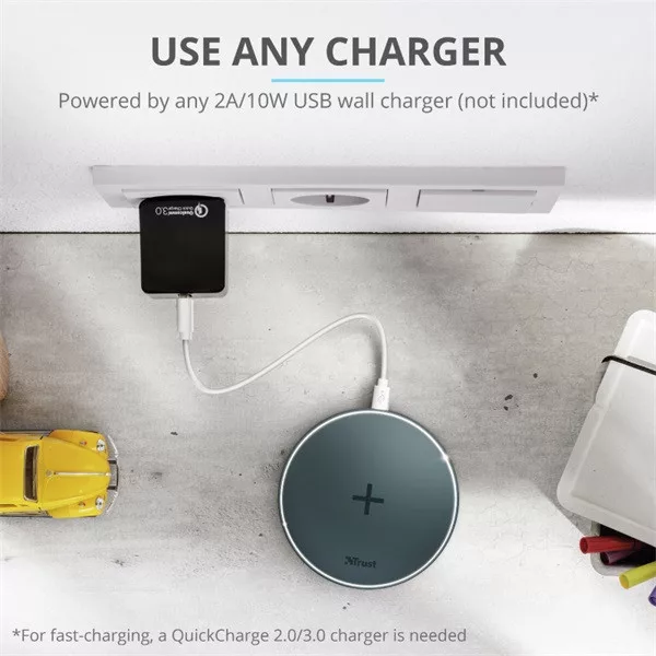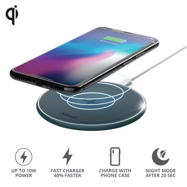 - teljesen vezeték nélküli töltés Qi kompatibilis telefonokhoz- érints-és-tölts: csak tedd a telefonodat az eszközre és automatikusan töltődni kezd- gyors és okos: maximális erővel tölti a az adott készüléket (gyorstöltés akár 7.5 W-ig iPhone, 10 W-ig Samsung Galaxy USB-s fali töltővel mely QuickCharge 2.0 / 3.0 kompatibilis)- Qi tanúsítvánnyal rendelkezik- mindegyik Qi kompatibilis telefonnal működik ( Apple, Samsung is) - okos biztonsági dizájn ( FOD) mely megelőzi a fém eszközök rongálódását- éjszakai mód: a jelzőfény kikapcsol automatikusan 20 másodperc utánGyártói specifikáció:
